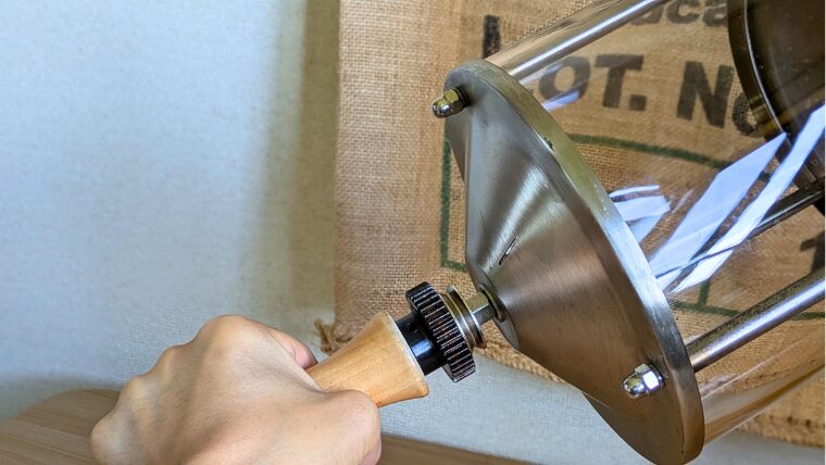 特に豆を入れる時に片方の手でガラスドラムを縦にして、もう片方の手でコーヒー生豆を入れることになるのでその時の負担が大きいかも。